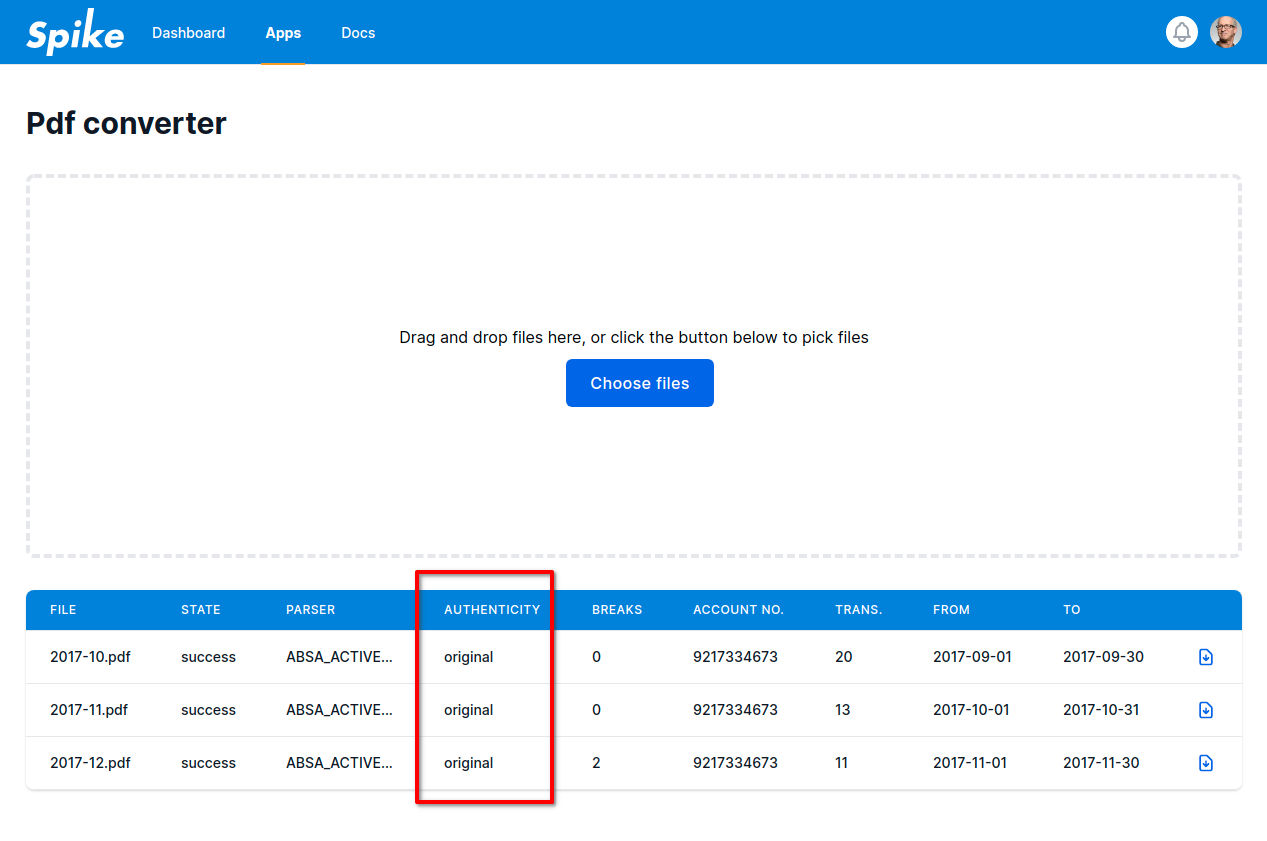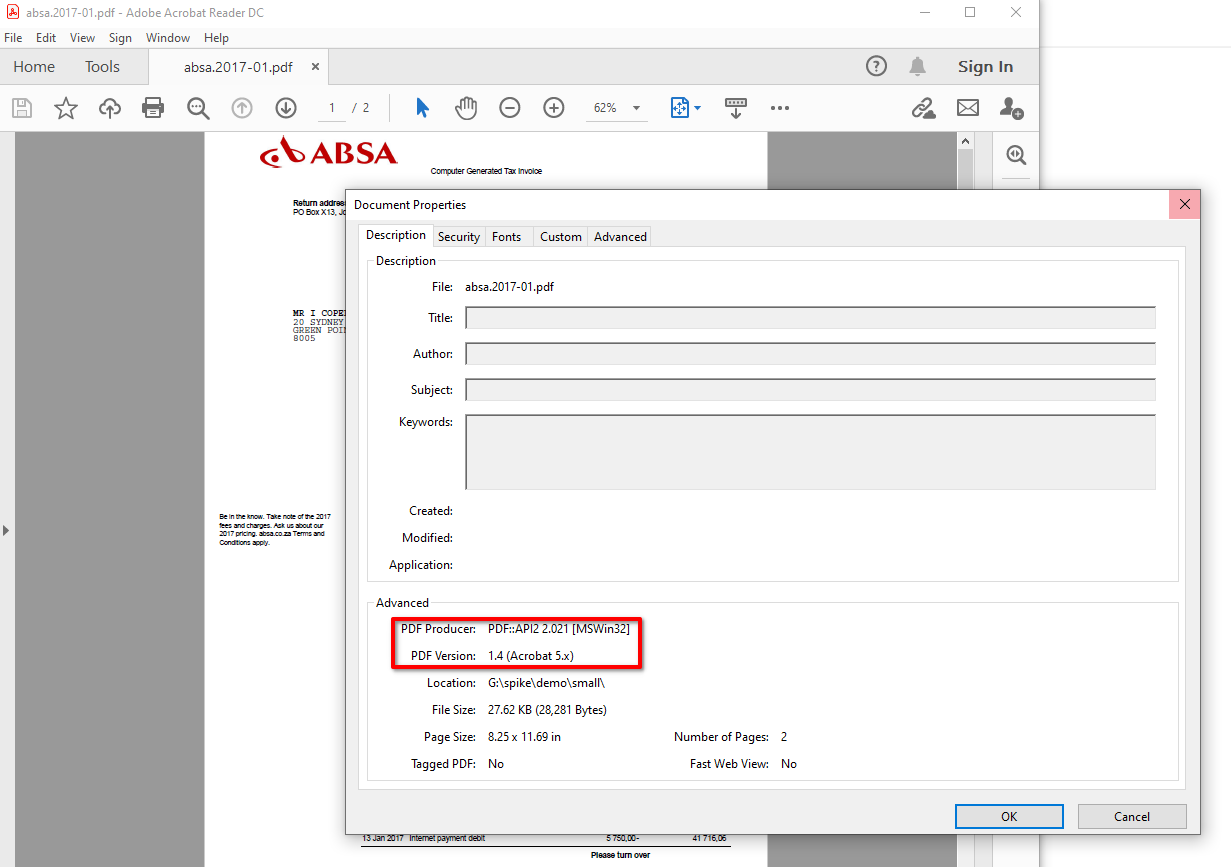 When we receive at a pdf we can use the meta data to check whether it is the original pdf that was produced by the bank, or whether it has been modified by some other pdf software. Note that this is complicated slightly by a number of factors: