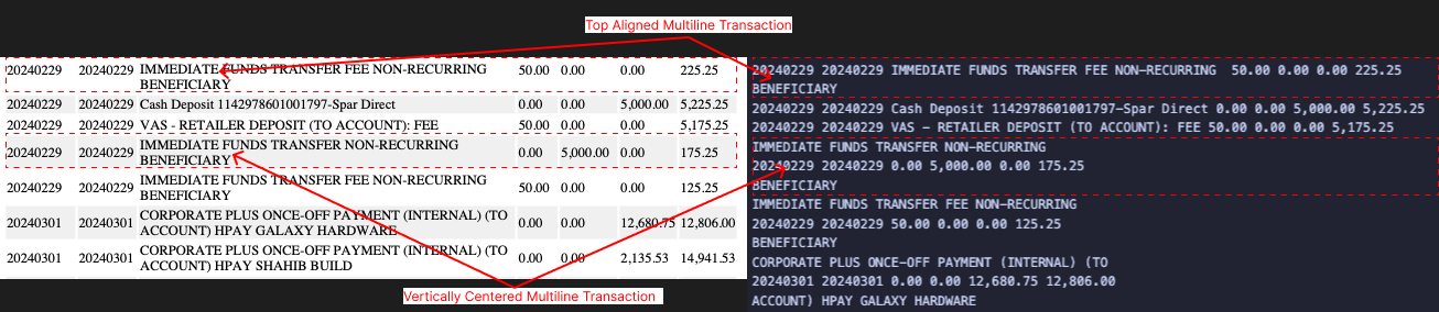 Very rarely statements contain both top-aligned and Vertically-centered transactions. Unfortunately these transactions cant be reliably joined because a parser can only assume one of the two algorithm's at a time and cannot be programmatically determined on a per line basis, therefore changing which algorithm is used changes how all the transactions are joined in the entire statement, for example by assuming all transactions are top-aligned the vertically-centered transactions will be incorrectly joined with previous rows and by assuming all are Vertically-centered the top-aligned transactions will be incorrectly joined with previous rows.
