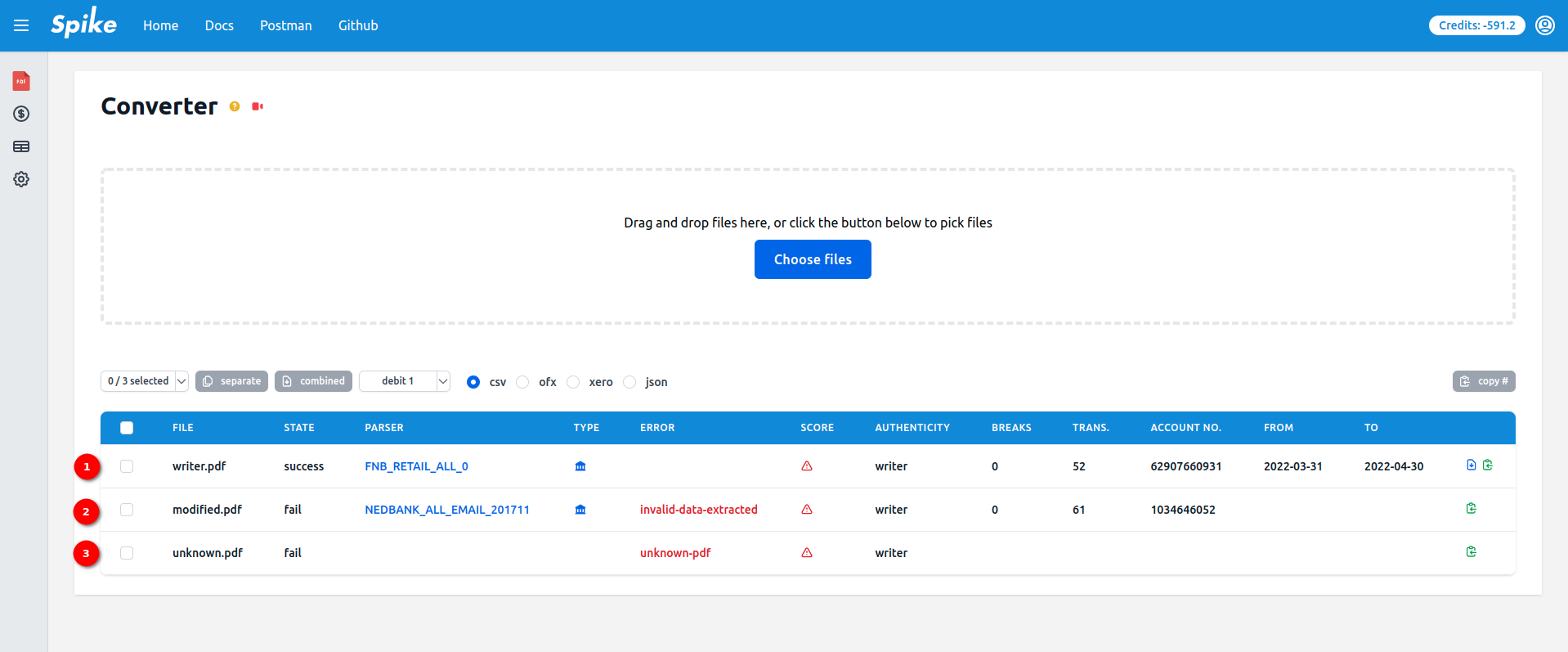 - success = the pdf may be successfully processed in the case where the modification didn't impact the pdf structure sufficiently. Always look out for warnings on the score & authenticity fields, even if a statement parses successfully.