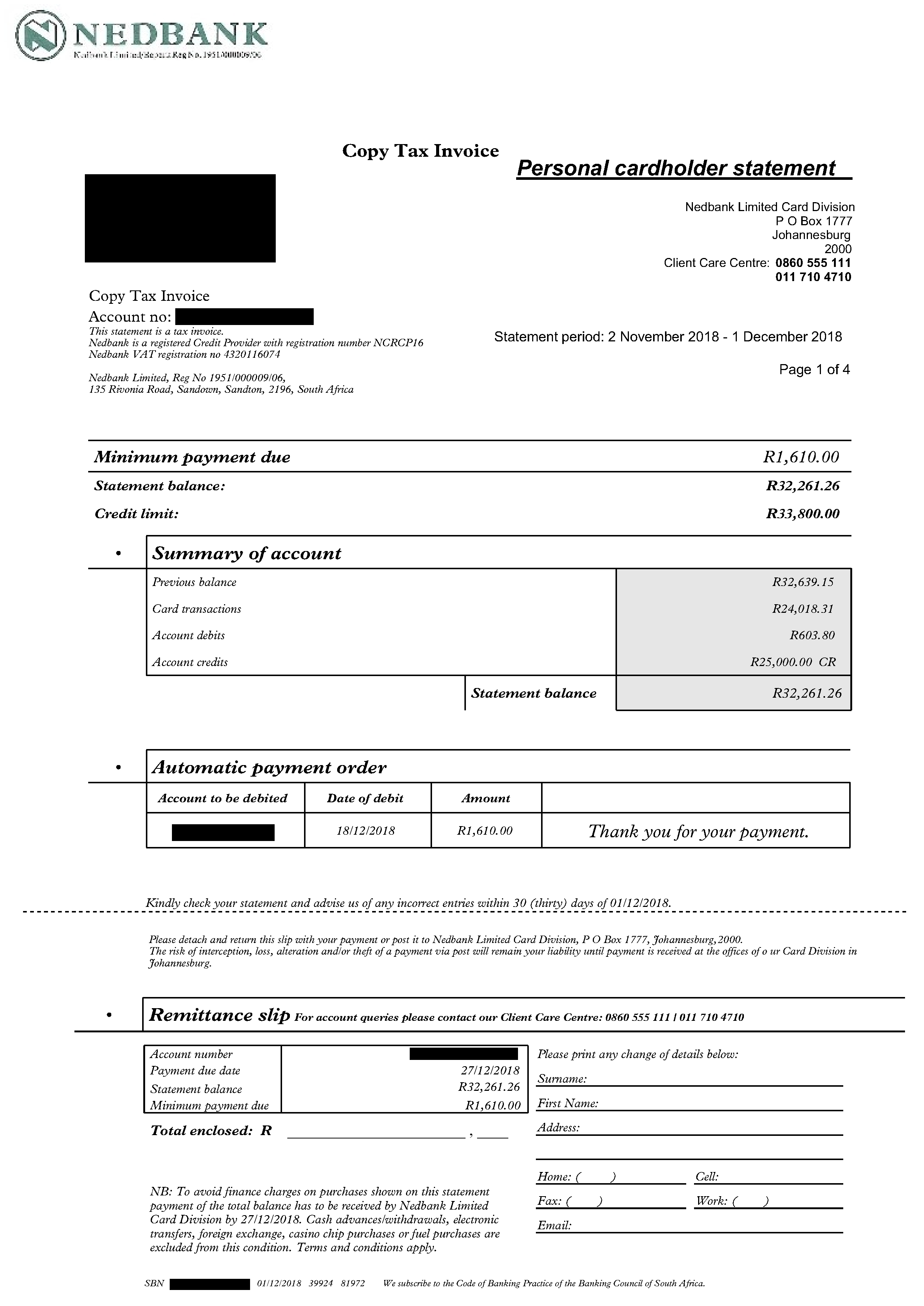 | NEDBANK | credit card | breakdown | NEDBANK_CREDITCARD |