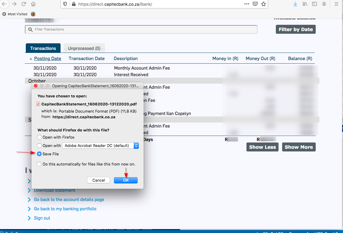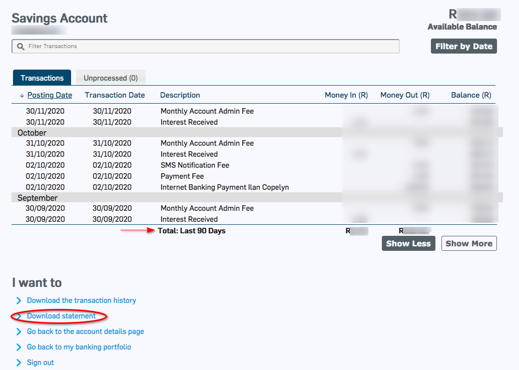 - When you are satisfied with your transaction history (i.e 90 days), select 'Download Statement'